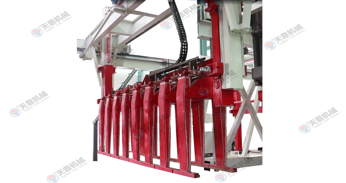 成品分垛吊機(jī):將蒸養(yǎng)車(chē)上的一模坯體吊運(yùn)至掰板輸送機(jī)上,然后將空側(cè)板吊運(yùn)至蒸養(yǎng)車(chē)上;切割工段空翻脫模機(jī)將??蚍D(zhuǎn)90°,放在切割小車(chē)支座上進(jìn)行脫模,脫模后的??蚺c清理后的側(cè)模板進(jìn)行合模,合膜后的空??虮坏?..