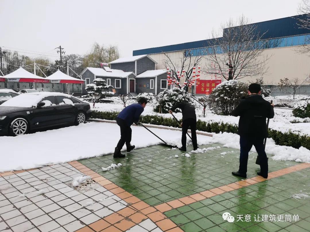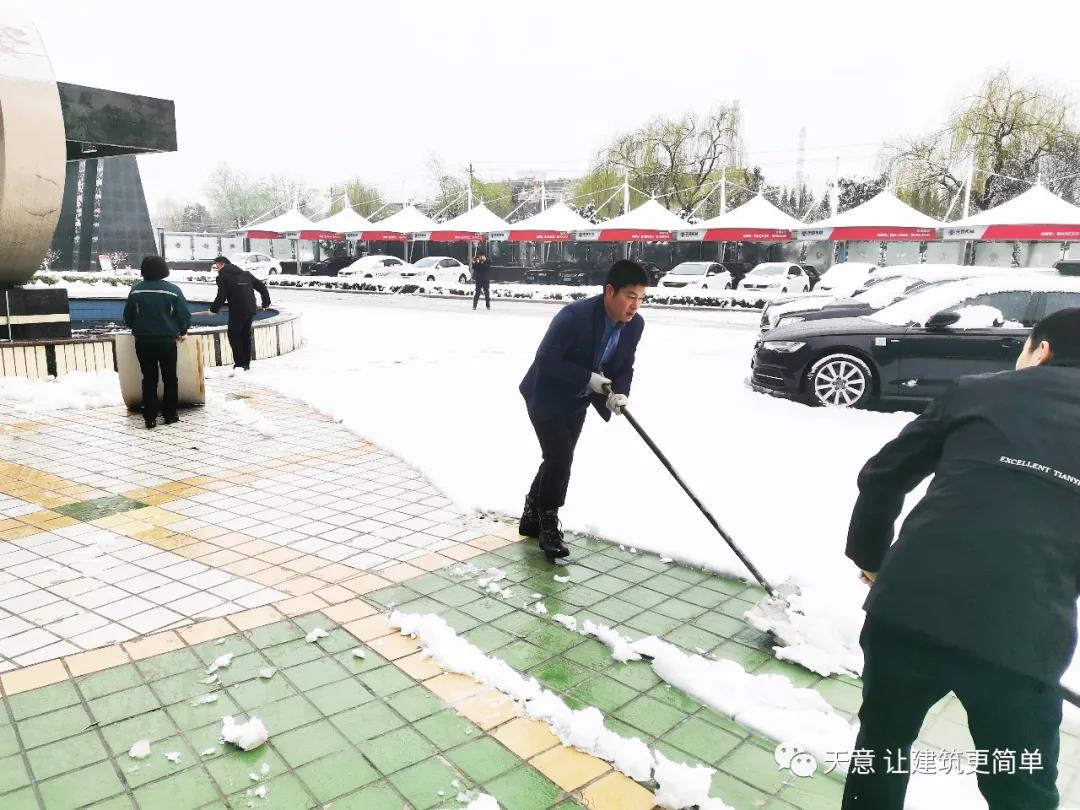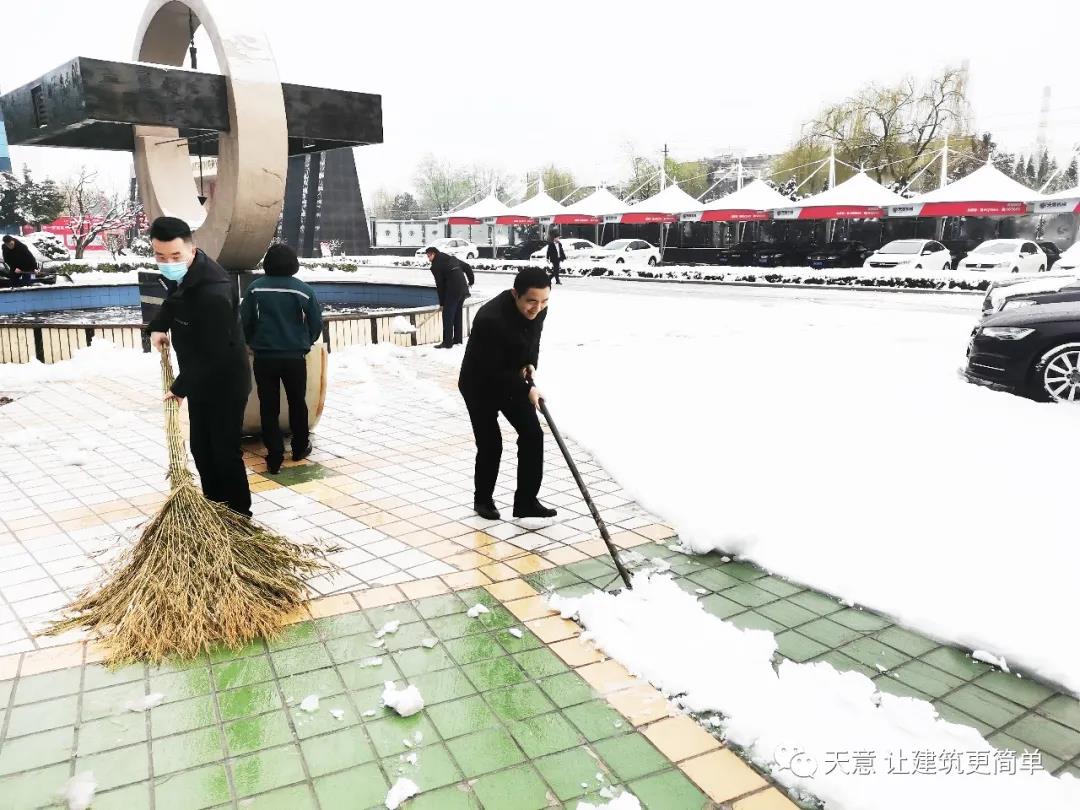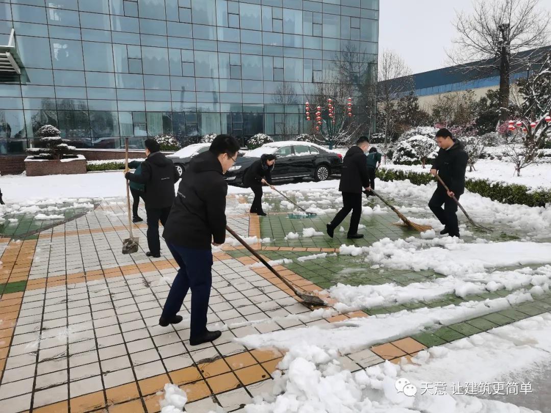 大雪悄然而至,一覺起來,窗外已是銀裝素裹。然而大雪的降臨也給大家的出行帶來諸多不便,公司大門口、辦公樓前的道路都被皚皚白雪覆蓋。早晨上班前,公司總經(jīng)理劉海龍、營(yíng)銷總監(jiān)郭川東帶領(lǐng)公司員工拿起掃帚鐵锨,滿懷激情,投入除雪當(dāng)中。整個(gè)除雪作業(yè)過程井然有序,熱火朝天,干勁十足,大家不懼寒冷,不怕手凍。鐵锨和地面的碰擊聲、掃帚清掃雪花的刷刷聲,不一會(huì)兒辦公樓前的積雪已蹤影全無(wú),所到之處,雪沒了,路干凈了,掛滿枝頭的冰凌隨風(fēng)婆娑起舞,點(diǎn)頭稱贊,大家的心中更是無(wú)比的欣慰,雖然凍紅了臉、累出了汗,但累并快樂著。